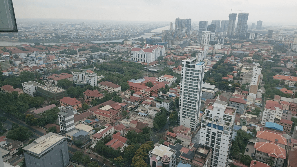 東アジアを貫通するメコン川とその支流のトンレサップ川とバサック川という三つの川が集まる河口と高層ビルが立ち並ぶ大都会プノンペンの街が一望に見下ろせる風景は圧巻でした。